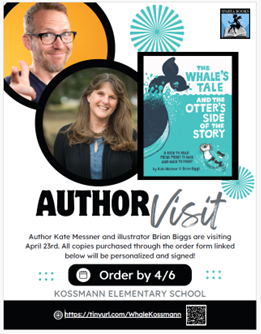 NYTimes Bestselling author Kate Messner and illustrator Brian Biggs will be visiting Kossmann grades PK-2 on April 23rd, Take Your Child to Work Day. Purchase books for Kate Messner by April 6th! Order here: https://tinyurl.com/WhaleKossmann |