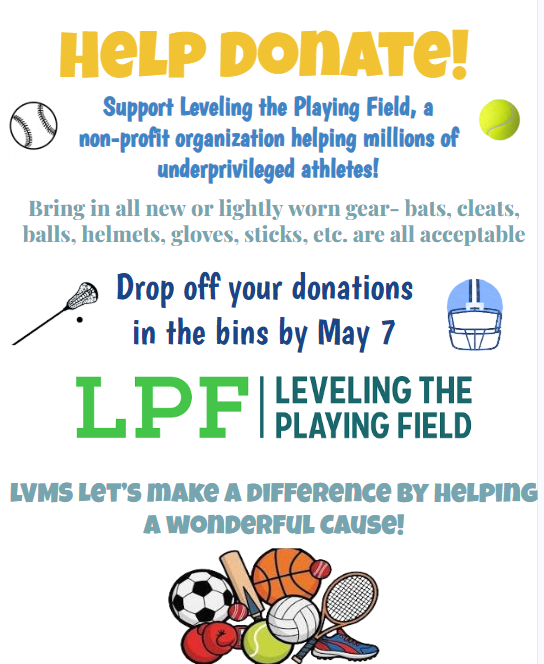LEVEL THE PLAYING FIELD ITEM DRIVE: Please help donate to the School's Sports Drive that supports Leveling the Playing Field by dropping off old sports equipment. Look for the bins at the main entrance and in the halls. Please help by getting all your donations in by Friday, May 8. More Information included below!