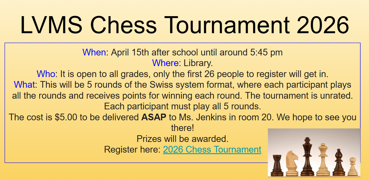 We are happy to announce our 2026 End of Year activities that are planned for our 8th Graders! Our 8th Grade teachers have been working hard to plan a variety of exciting activities to celebrate the LVMS Class of 2026. Please check your email for detailed information and permission slips for these end-of-year events! This information will also be sent home with your children on Thursday, March 26th.